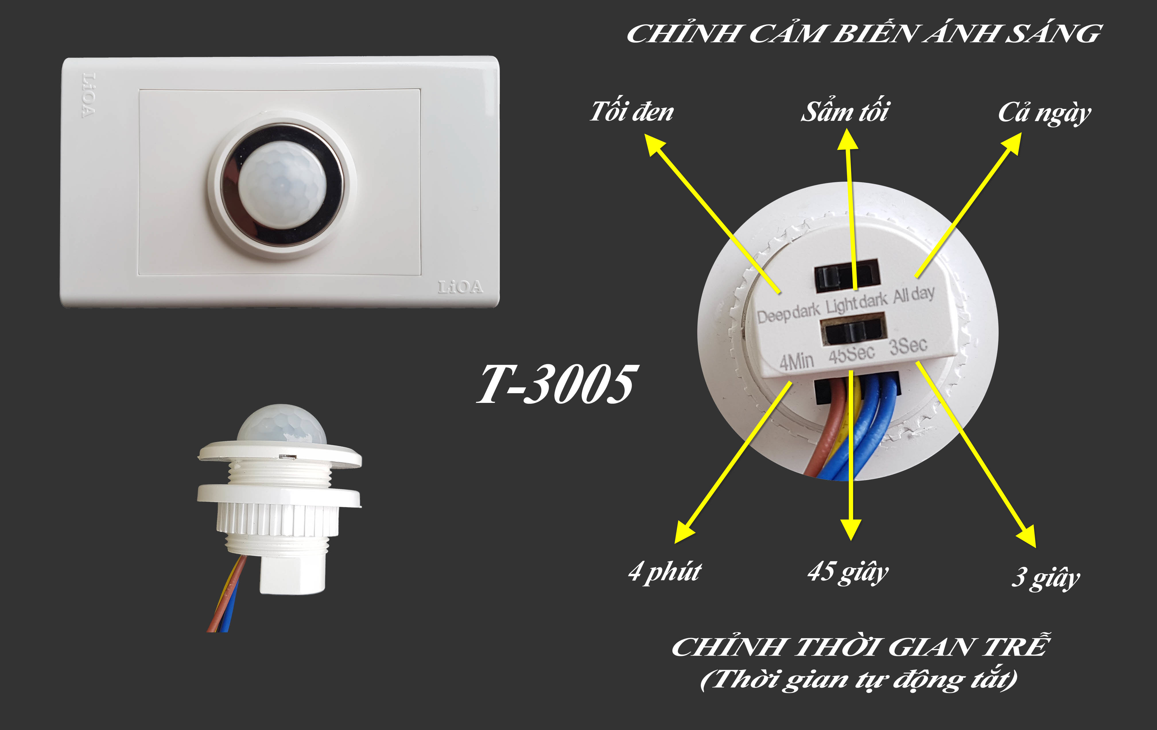 Chú ý: Model T-3002 không điều chỉnh được thông số thời gian trễ và cảm biến ánh sáng. Mặc định thời gian trễ vào khoảng 30-45 giây, chỉ hoạt động khi môi trường sẩm tối.