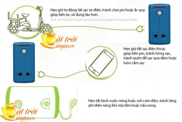 Hẹn giờ sau một khoảng thời gian thì ngắt điện. Dùng để ngắt điện khi sạc pin các đồ chạy pin như điện thoại, laptop…, giữ cho tuổi thọ thiết bị nâng cao, nhất là ban đêm , điện đóm phập phù .